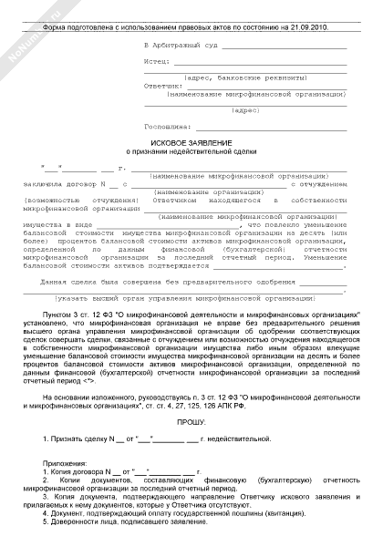 - 1442Исковое заявление в арбитражный суд о признании недействительной сделки, связанной с отчуждением или возможностью отчуждения находящегося в собственности микрофинансовой организации имущества либо иным образом влекущей уменьшение балансовой стоимости имущества микрофинансовой организации на десять и более процентов балансовой стоимости активов микрофинансовой организации, определенной по данным финансовой (бухгалтерской) отчетности микрофинансовой организации за последний отчетный период, совершенной без предварительного одобрения высшего органа управления микрофинансовой организации