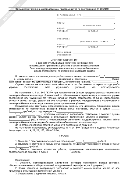- 1454Исковое заявление вкладчика в арбитражный суд о возврате суммы вклада, уплате на нее процентов и возмещения причиненных убытков в связи с невыполнением банком предусмотренных законом или договором банковского вклада обязанностей по обеспечению возврата вклада