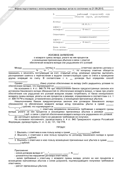 - 1455Исковое заявление вкладчика в суд общей юрисдикции о возврате суммы вклада, уплате на нее процентов и возмещении причиненных убытков в связи с утратой обеспечения возврата вклада или ухудшением его условий