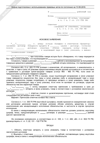 - 1441Исковое заявление заемщика в суд общей юрисдикции об обязании кредитора затарить и (или) упаковать товар, переданный по договору товарного кредита, без тары и (или) упаковки