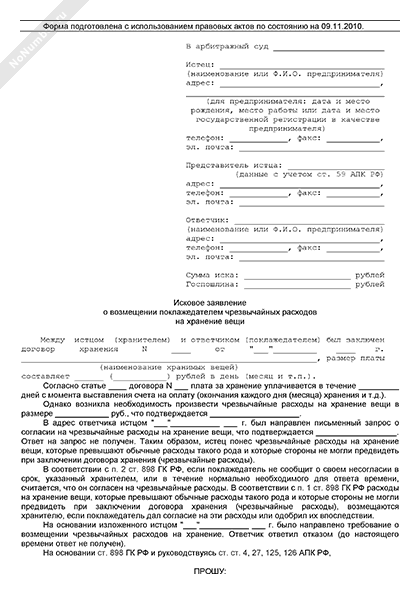 - 1482Исковое заявление хранителя в арбитражный суд о возмещении поклажедателем чрезвычайных расходов на хранение вещи