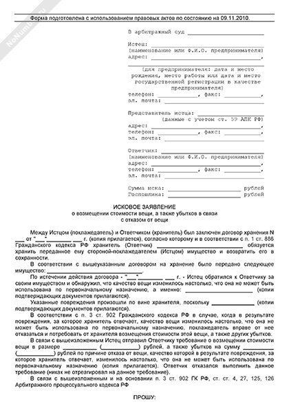 - 1489Исковое заявление поклажедателя в арбитражный суд о возмещении хранителем стоимости вещи, а также убытков в связи с отказом от вещи, качество которой в результате повреждения, за которое хранитель отвечает, изменилось настолько, что она не может быть использована по первоначальному назначению