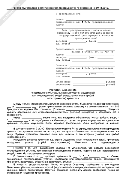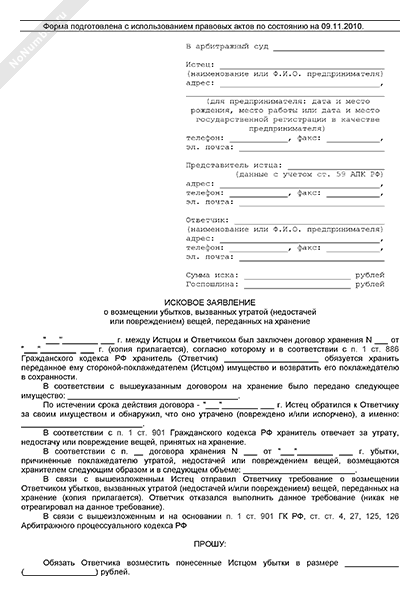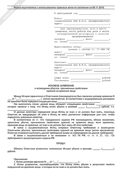 - 1487Исковое заявление поклажедателя в арбитражный суд о возмещении хранителем убытков, вызванных утратой, недостачей или повреждением вещей, переданных на хранение