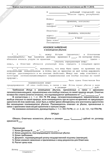- 1493Исковое заявление в суд общей юрисдикции о возмещении поклажедателем убытков, причиненных в связи с хранением легковоспламеняющихся, взрывоопасных или вообще опасных по своей природе вещей