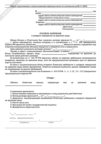 - 1492Исковое заявление поклажедателя в суд общей юрисдикции о возврате хранителем переданной на хранение вещи