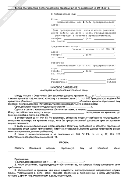 - 1491Исковое заявление поклажедателя в арбитражный суд о возврате хранителем переданной на хранение вещи