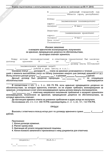 - 1496Исковое заявление поклажедателя в суд общей юрисдикции о возврате хранителем вознаграждения, полученного за хранение, прекращенное досрочно по обстоятельствам, за которые хранитель отвечает
