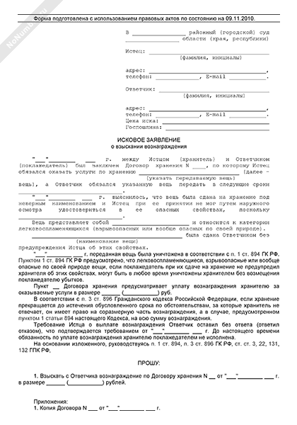 - 1494Исковое заявление хранителя в суд общей юрисдикции о взыскании с поклажедателя вознаграждения за хранение легковоспламеняющихся, взрывоопасных или вообще опасных по своей природе вещей, уничтоженных хранителем