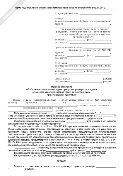 - 1483Исковое заявление поклажедателя в арбитражный суд об обязании хранителя передать сумму, вырученную от продажи вещи, срок хранения которой истек, за вычетом сумм, причитающихся хранителю