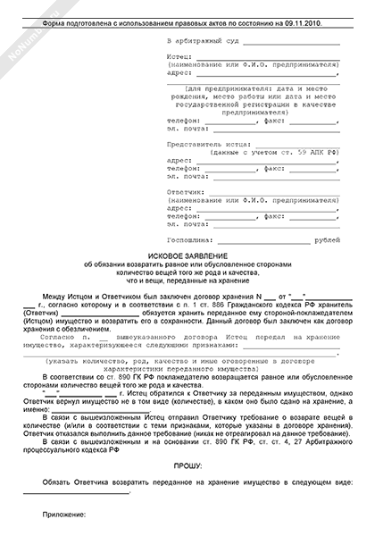 - 1486Исковое заявление в арбитражный суд об обязании хранителя возвратить равное или обусловленное сторонами количество вещей того же рода и качества, что и вещи, переданные на хранение