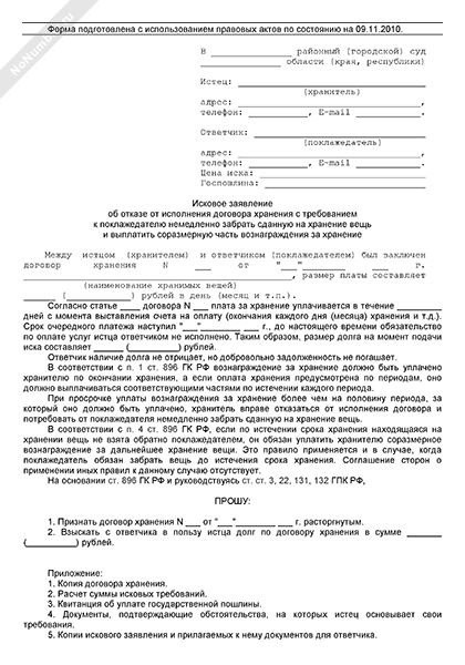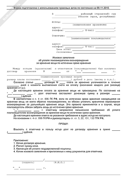 - 1497Исковое заявление хранителя в суд общей юрисдикции об уплате поклажедателем вознаграждения за хранение вещи по истечении срока хранения