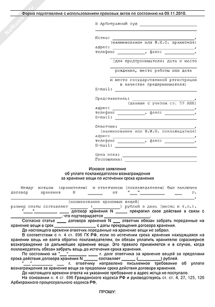 - 1498Исковое заявление хранителя в арбитражный суд об уплате поклажедателем вознаграждения за хранение вещи по истечении срока хранения