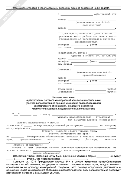 - 1744Исковое заявление пользователя в арбитражный суд о расторжении договора коммерческой концессии и возмещении убытков по причине изменения правообладателем коммерческого обозначения, входящего в комплекс исключительных прав, предоставленных пользователю