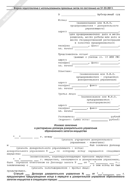 - 1754Исковое заявление в арбитражный суд о расторжении договора доверительного управления обремененного залогом имущества