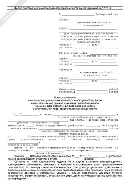 - 1745Исковое заявление пользователя в арбитражный суд о соразмерном уменьшении причитающегося правообладателю вознаграждения по причине изменения правообладателем коммерческого обозначения, входящего в комплекс исключительных прав, предоставленных пользователю