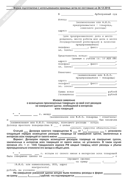 - 1747Исковое заявление товарища в арбитражный суд о возмещении произведенных им за свой счет расходов на совершение сделки, необходимой в интересах всех товарищей
