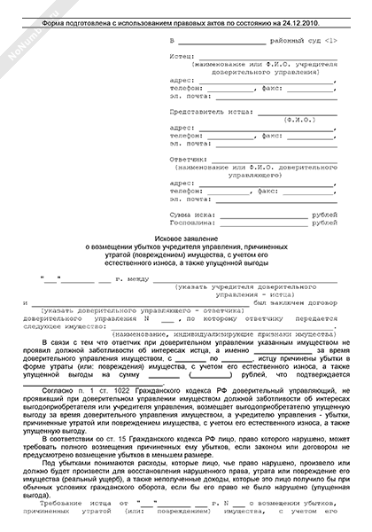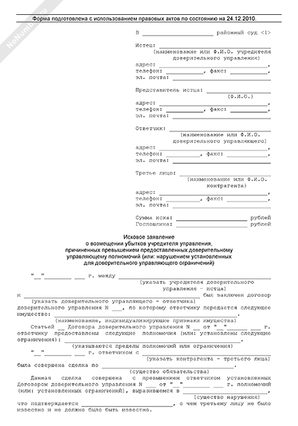 - 1741Исковое заявление учредителя управления в суд общей юрисдикции о возмещении убытков, причиненных превышением предоставленных доверительному управляющему полномочий или нарушением установленных для доверительного управляющего ограничений