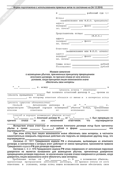 - 1752Исковое заявление принципала в суд общей юрисдикции о возмещении убытков, причиненных ему прекращением агентского договора по причине отказа от него агента в условиях, когда принципал лишен возможности иначе обеспечить свои интересы