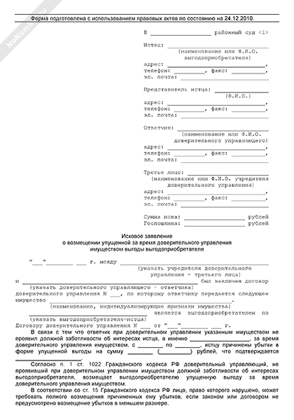 - 1758Исковое заявление выгодоприобретателя в суд общей юрисдикции о возмещении упущенной выгоды за время доверительного управления имуществом в связи с тем, что доверительный управляющий не проявил должной заботливости об интересах выгодоприобретателя