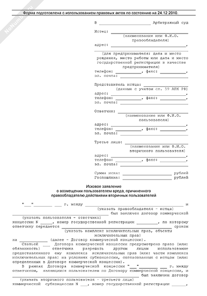 - 1743Исковое заявление правообладателя в арбитражный суд о возмещении пользователем вреда, причиненного действиями вторичных пользователей