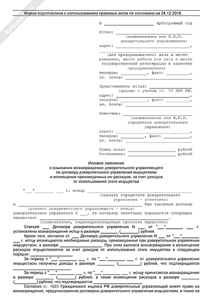 - 1742Исковое заявление доверительного управляющего в арбитражный суд о взыскании вознаграждения по договору доверительного управления имуществом и возмещения произведенных расходов за счет доходов от использования этого имущества