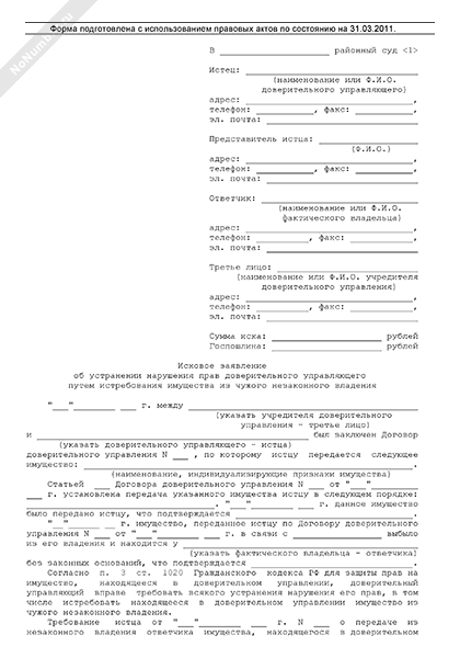 - 1755Исковое заявление доверительного управляющего в суд общей юрисдикции об устранении нарушения его прав путем истребования имущества из чужого незаконного владения