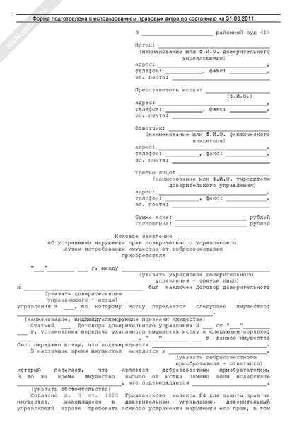 - 1756Исковое заявление доверительного управляющего в суд общей юрисдикции об устранении нарушения его прав путем истребования имущества от добросовестного приобретателя