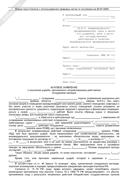 Исковое заявление индивидуального предпринимателя о взыскании ущерба, причиненного неправомерными действиями сотрудников милиции (рекомендуемый образец заполнения)