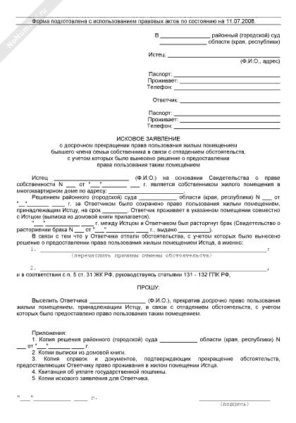 Исковое заявление о досрочном прекращении права пользования жилым помещением бывшего члена семьи собственника в связи с отпадением обстоятельств, с учетом которых было вынесено решение о предоставлении права пользования таким помещением (рекомендуемый образец заполнения)