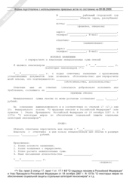 Исковое заявление о перерасчете и взыскании невыплаченных сумм пенсий (рекомендуемый образец заполнения)