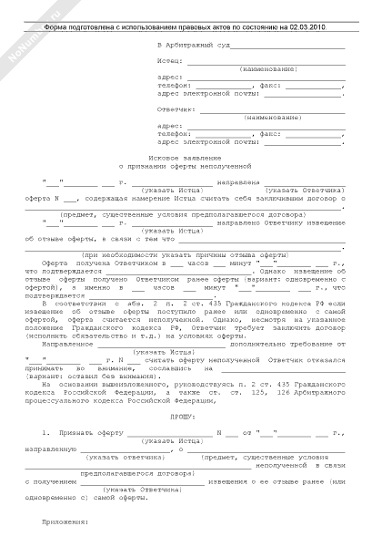 Исковое заявление в арбитражный суд о признании оферты неполученной