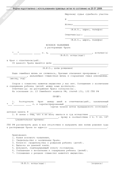 Исковое заявление о расторжении брака (с рассмотрением дела в отсутствие истца)