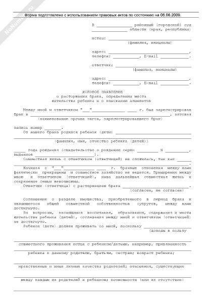 Исковое заявление о расторжении брака, определении места жительства ребенка и о взыскании алиментов (рекомендуемый образец заполнения)