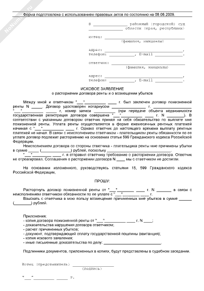 Исковое заявление о расторжении договора ренты и о возмещении убытков (рекомендуемый образец заполнения)