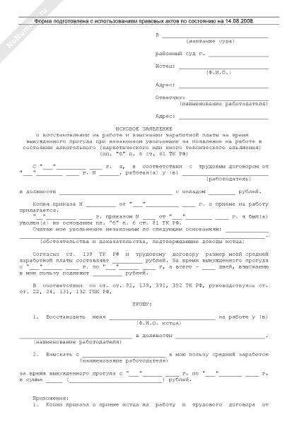 Исковое заявление о восстановлении на работе и взыскании заработной платы за время вынужденного прогула при незаконном увольнении за появление на работе в состоянии алкогольного (наркотического или иного токсического опьянения)