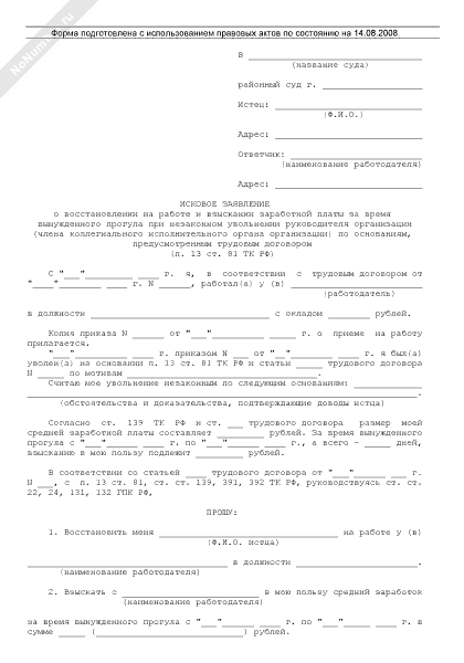 Исковое заявление о восстановлении на работе и взыскании заработной платы за время вынужденного прогула при незаконном увольнении руководителя организации (члена коллегиального исполнительного органа организации) по основаниям, предусмотренным трудовым договором