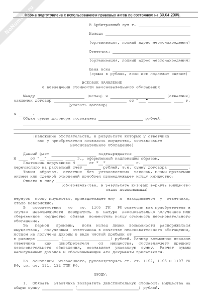 Исковое заявление о возмещении стоимости неосновательного обогащения