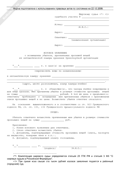 Исковое заявление о возмещении убытков, причиненных пропажей вещей из автоматической камеры хранения транспортной организации (рекомендуемый образец заполнения)