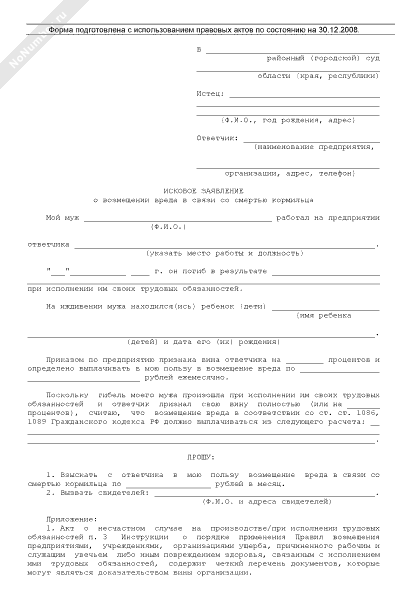 Исковое заявление о возмещении вреда в связи со смертью кормильца