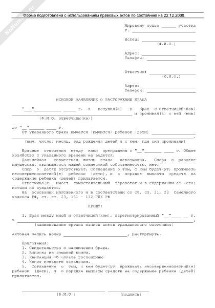 Исковое заявление о расторжении брака