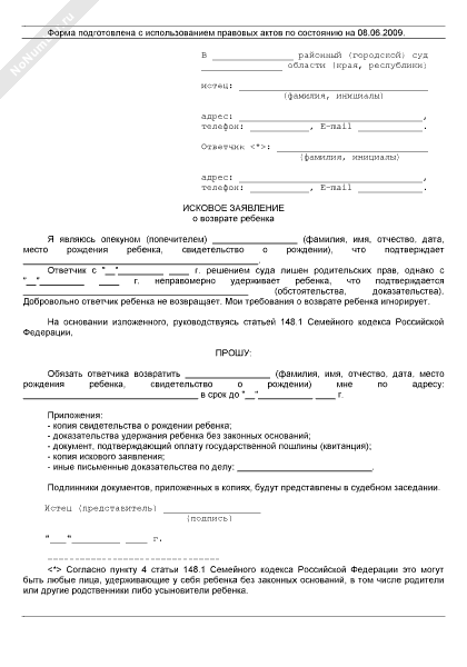 Исковое заявление о возврате ребенка