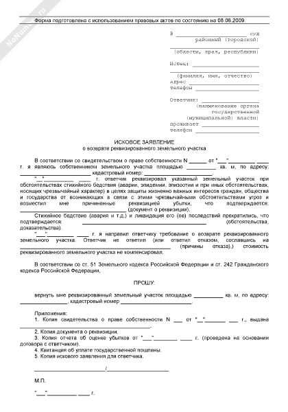 Исковое заявление о возврате реквизированного земельного участка (рекомендуемый образец заполнения)