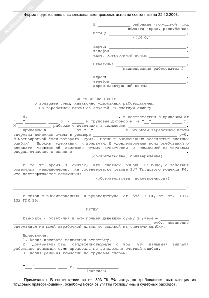 Исковое заявление о возврате сумм, удержанных работодателем из заработной платы, излишне выплаченных вследствие счетных ошибок (рекомендуемый образец заполнения)