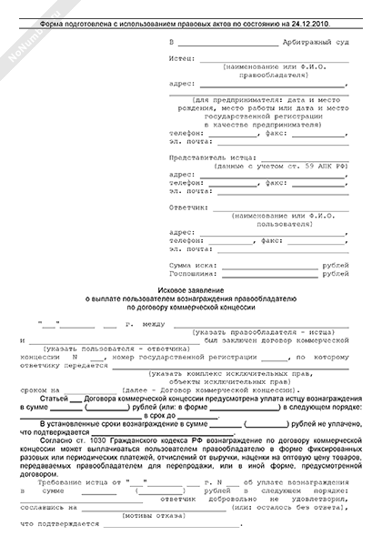 Исковое заявление правообладателя в арбитражный суд о выплате пользователем вознаграждения по договору коммерческой концессии (рекомендуемый образец заполнения)