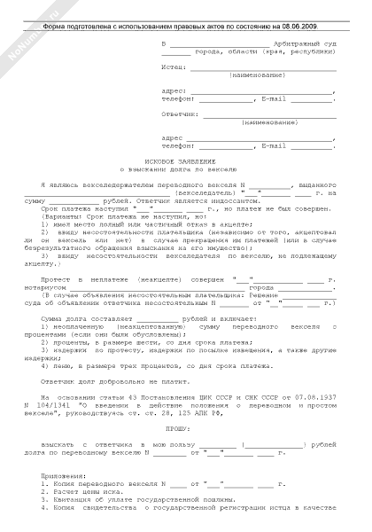 Исковое заявление в арбитражный суд о взыскании долга по векселю