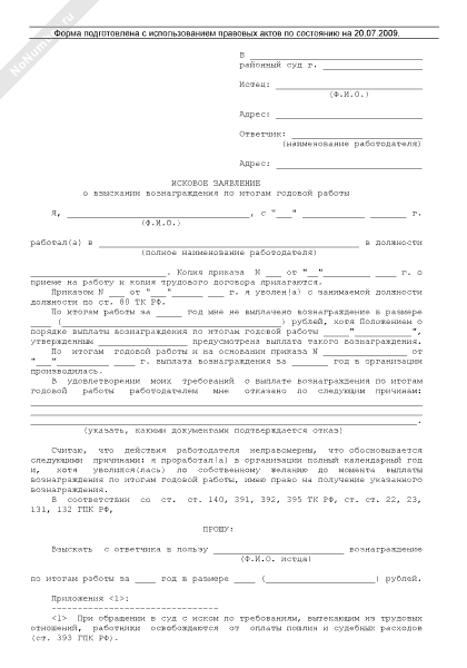 Исковое заявление о взыскании вознаграждения по итогам годовой работы