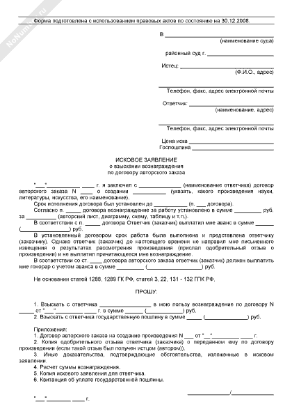 Исковое заявление о взыскании вознаграждения по договору авторского заказа (рекомендуемый образец заполнения)