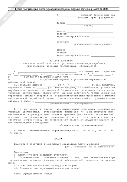 Исковое заявление о взыскании заработной платы при невыполнении работником норм выработки (неисполнении трудовых (должностных) обязанностей)