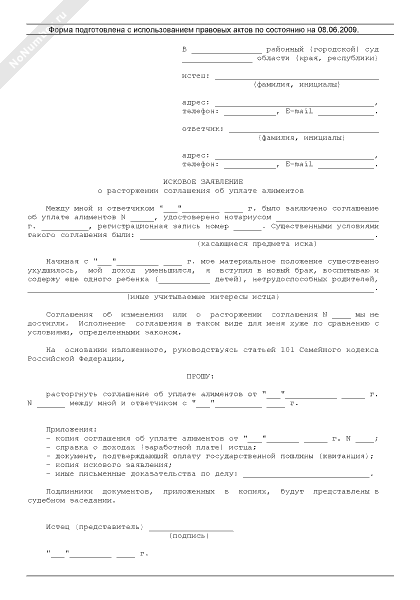 Исковое заявление о расторжении соглашения об уплате алиментов