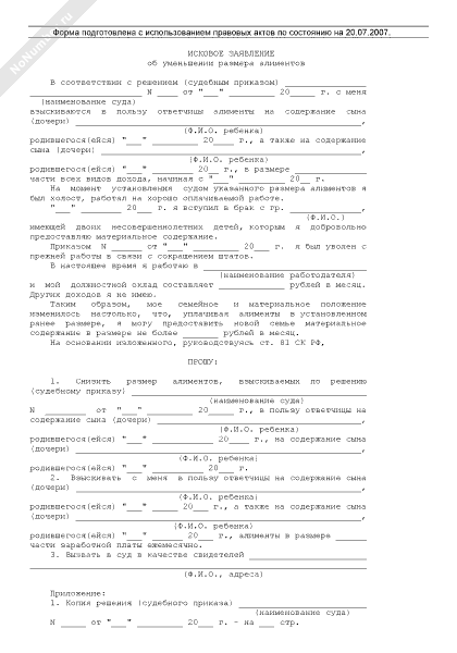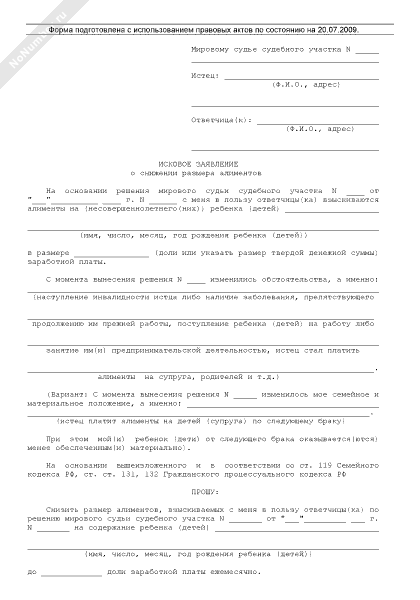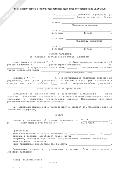Исковое заявление об изменении соглашения об уплате алиментов (рекомендуемый образец заполнения)